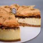 Creamy cheesecake topped with fresh pistachios and layers of crunchy baklava — a perfect fusion of rich flavors and textures.