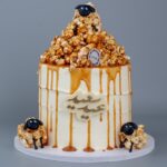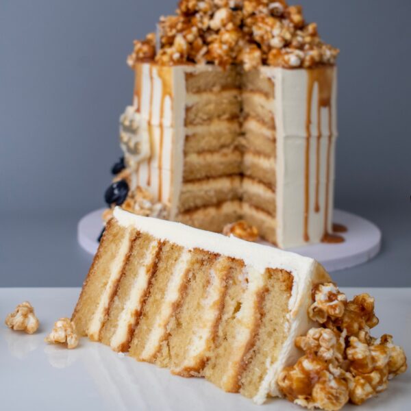 2 kg of moist vanilla cake layered with rich salted caramel and topped with caramelized popcorn — a perfect blend of sweetness and crunch in every bite.